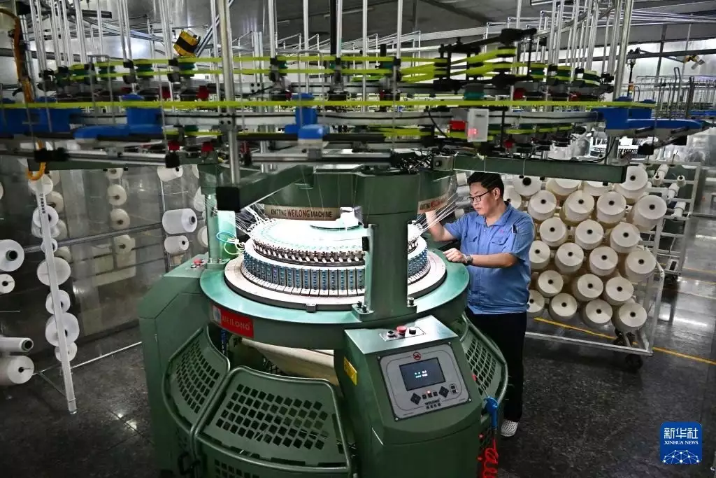 即墨区一家智慧纺纱企业的技术人员在维护生产高档布料的自动化圆机(3月25日摄)。新华社记者 李紫恒 摄